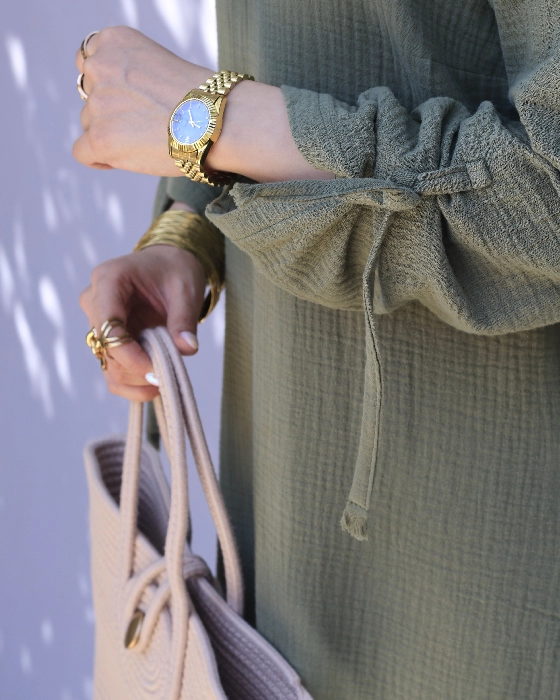 کفتان سبز چیندار را می‌توان با انواع شال و روسری، کیف و کفش ست کرد و از استایلی شیک و زنانه در روزهای گرم سال لذت برد.