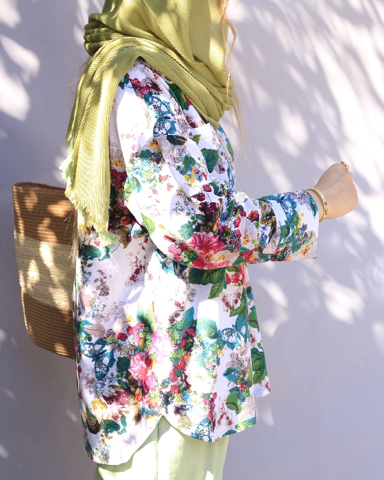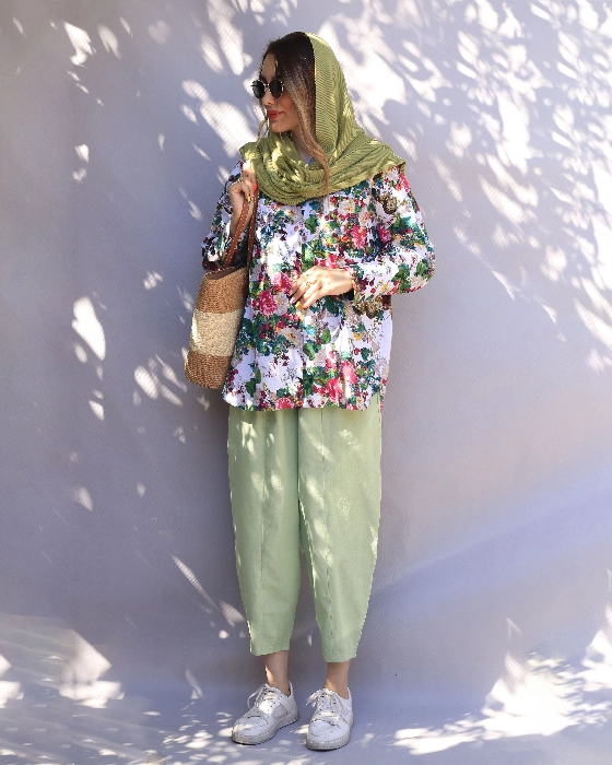 - طرحهای استوایی جذاب: طرحهای گلهای استوایی بزرگ و رنگارنگ، برگهای نخل و میوههای گرمسیری روی این شومیز، شما را به سواحل شنی و آبهای نیلگون هاوایی میبرد. این طرحها، حس آرامش و نشاط را به شما منتقل میکنند و به استایل شما ظاهری منحصر به فرد میبخشند.